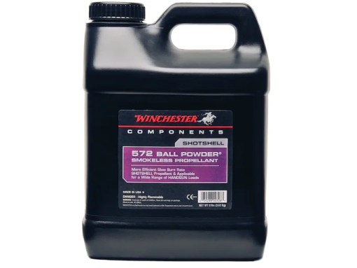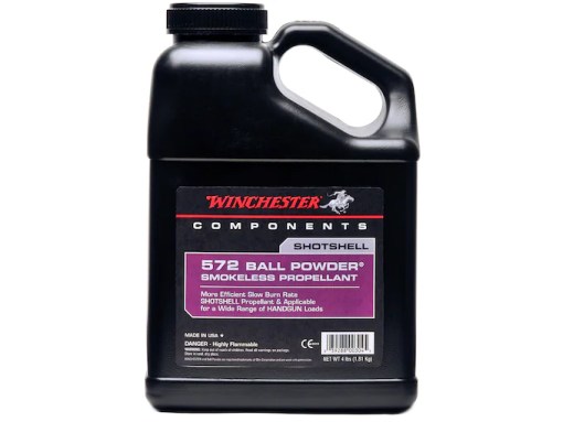 Winchester 572 Shotshell Ball Powder Smokeless Propellant optimizes handgun and shotshell loads. 572 achieves the 3-1/4-dram equivalent, 1-1/4-oz. For pheasant hunters and back fence competitions, 12-ga. factory Winchester load may reach 1330 fps with any case. Excellent 20-ga. and 28-ga. clay target and field load capability. Winchester 572 performs well with 16-gauge field loads. 572 excels in 25-45 ACP pistol calibers.